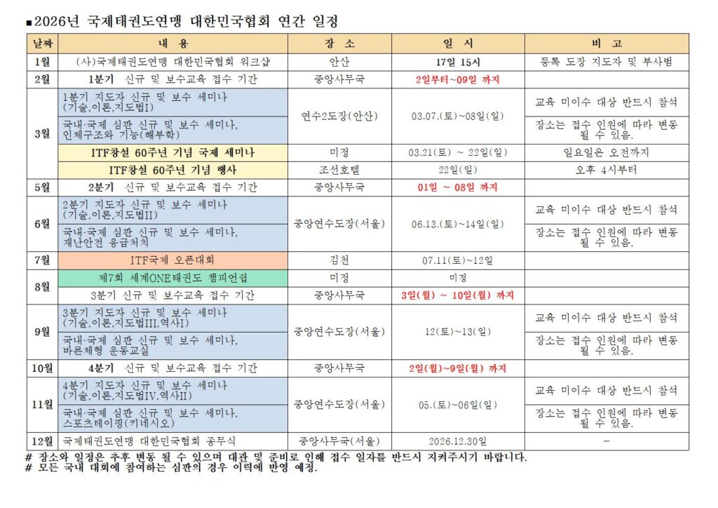 2026년 (사)국제태권도연맹 대한민국협회 연간 일정 공지